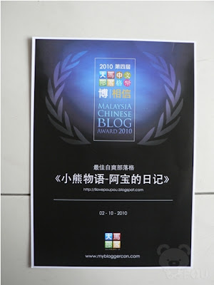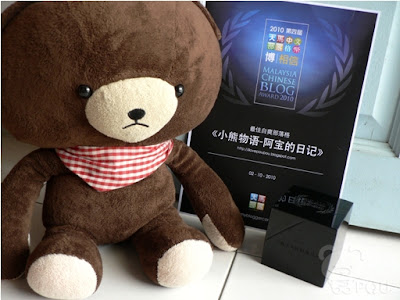 这个奖项是一份秋天的礼物。十个月前当阿宝的日记开跑时,每想到十个月的今天会得到了这个最佳自爽部落格奖,这下真是爽呆了!!哈哈!这个奖项有点像是<<小熊物语-阿宝的日记>>怀胎十月后诞生的首个结晶品呢!不过还是要感谢主办单位大马中文部落格,以及那位当初叫阿宝去参赛的朋友~ Ah Seng,还有一群一直以来与阿宝一路相伴的朋友!谢谢大家!