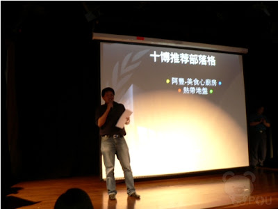 不知不觉的已经颁了好几个奖项啦!有些入围博客们没出席 所以没得见到他们的真面目,但是传说中的厨神既是美食心厨房的博主-阿丰有出席哦!终于有机会见到他的真人啦!而且他还得了十大推荐部落客奖呢!在他的得奖感言中他说了一句的话,他说:“谢谢我的太太,我愿意当她一辈子的厨师!”天啊!这除了是得奖感言,而且还是十大推荐最佳爱的宣言呢!