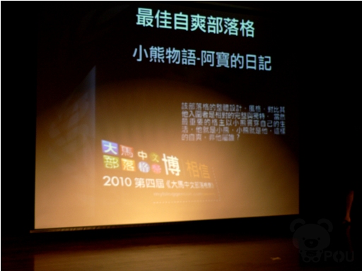 啊!没想到最后出现在得奖荧幕上的竟然是“小熊物语-阿宝的日记”!哈哈哈!阿宝得奖了!这是真的吗?这一刻虽然很高兴但真的有点不大敢相信阿!但阿宝还是上台领奖了!