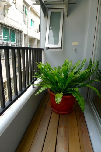 早晨的時光我愛呆在陽臺發發呆,看看書。陽臺的地闆是南方鬆木的防腐闆材,加上眼前有一顆山蘇盆栽會讓人瀋浸在一種大自然的氛圍裡。這房間裡的陽臺可是我夢寐以求的。